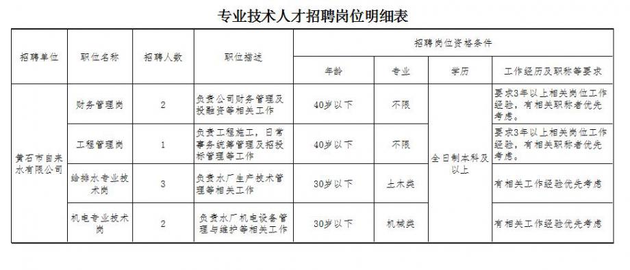 報名者應(yīng)符合《黃石市自來水有限公司專業(yè)技術(shù)人才招聘崗位明細表》(以下簡稱《崗位表》)規(guī)定的年齡、專業(yè)、學歷等各項要求。