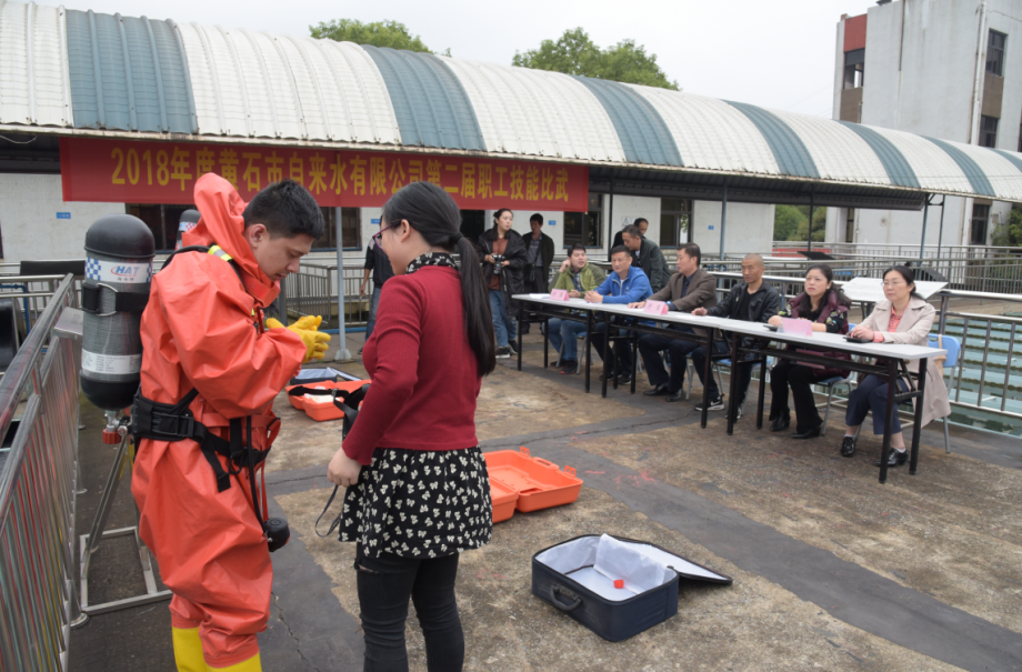 當(dāng)天上午,首先在公司二樓會(huì)議室舉行了“職工技能比武”理論考試。公司領(lǐng)導(dǎo)高度重視,現(xiàn)場巡視??荚囘^程中,參考人員和監(jiān)考人員嚴(yán)格遵守考試紀(jì)律,參考人員答題認(rèn)真,監(jiān)考人員監(jiān)考嚴(yán)格。在下午的實(shí)操考試中,共分為運(yùn)行值班工比賽、維修電工比賽、水質(zhì)檢驗(yàn)工比賽以及防化服穿戴等四個(gè)項(xiàng)目。其中,水質(zhì)檢驗(yàn)工比賽主要測試職工水質(zhì)檢驗(yàn)工基本理論知識(shí)和水質(zhì)日常檢測七項(xiàng)、九項(xiàng)指標(biāo)基礎(chǔ)理論知識(shí)。維修電工比賽需根據(jù)安全技術(shù)操作規(guī)程完成試題要求。運(yùn)行值班工比賽以現(xiàn)場答題的方式,回答評(píng)委提出的問題。防化服穿戴比賽,要求兩人一組相互配合,根據(jù)防化服穿戴規(guī)范程序在規(guī)定的時(shí)間內(nèi)正確完成穿戴。