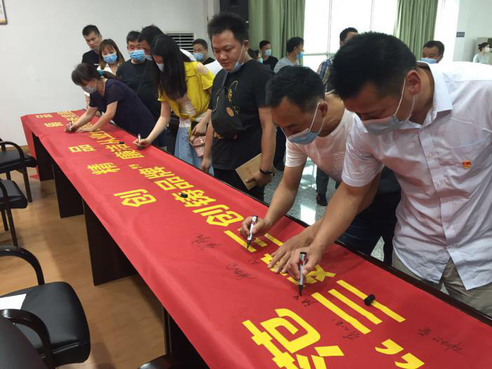 圖為第三、第四紀檢聯(lián)片區(qū)干部職工在“建示范、創(chuàng)精品、鑄品牌”橫幅上誓師簽名