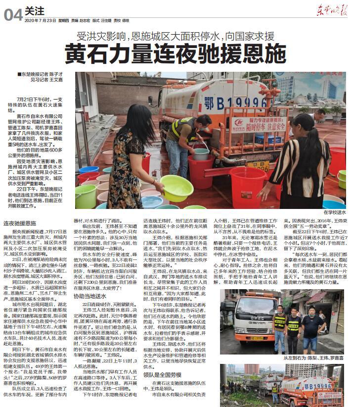 市自來水有限公司派專人支援恩施水司的舉動得到了《東楚晚報》記者關(guān)注,并于7月23日作了《受洪災(zāi)影響,恩施城區(qū)大面積停水,向國家求援——黃石力量連夜馳援恩施》專題報道,引起廣泛關(guān)注和好評。