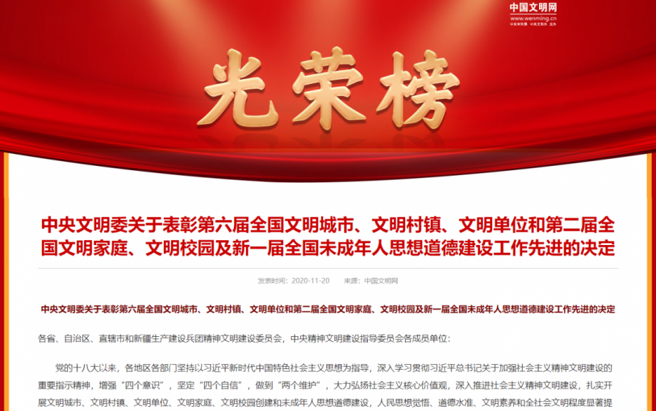 11月20日,《中央文明委關于表彰第六屆全國文明城市、文明村鎮(zhèn)、文明單位和第二屆全國文明家庭、文明校園及新一屆全國未成年人思想道德建設工作先進的決定》正式公布。
