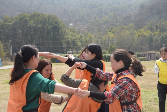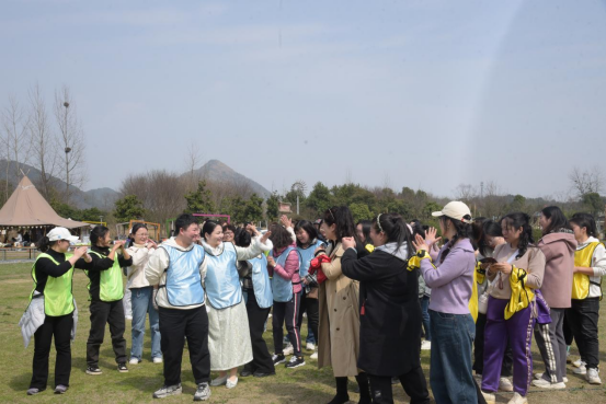 緊接著,女職工們在揉肩捶背、花開花落等熱身破冰運動后,組成5隊進行PK,團建趣味活動內容豐富多彩,既有跳大繩等傳統(tǒng)的體育項目,也有考驗團隊默契配合的“解手鏈”,還有考驗智慧的“算二十四點”。隊員們情緒高漲,各顯神通,使出渾身解數。整個賽場熱鬧非凡,口號聲、加油聲、吶喊聲、歡笑聲不絕于耳。