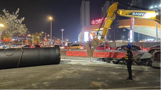 由于該施工現(xiàn)場(chǎng)屬于城市要道,車輛、來(lái)往行人多,交通壓力大,施工必須趕在夜間完成,早上6點(diǎn)前需要開放交通,施工時(shí)間極其緊迫。為盡快還路于民,減小對(duì)市民上下班及生活的影響。前期,市水務(wù)集團(tuán)工程公司多次組織技術(shù)人員深入現(xiàn)場(chǎng)勘察,科學(xué)研判,制定詳細(xì)的遷改方案。當(dāng)晚22時(shí),交通圍堵完成后,工程公司組織精兵強(qiáng)將,增配多臺(tái)機(jī)械設(shè)備同時(shí)投入戰(zhàn)斗?! ?/span>