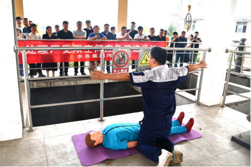 污水處理公司副經(jīng)理袁建軍同志作為指揮長(zhǎng)宣布演練開(kāi)始。花湖廠(chǎng)內(nèi)兩名巡視人員開(kāi)始在高效沉淀池污泥泵房進(jìn)行巡視,途中一名巡檢人員突發(fā)暈倒情況,另一名巡檢職工立即向廠(chǎng)長(zhǎng)報(bào)告并采取相應(yīng)措施,廠(chǎng)長(zhǎng)請(qǐng)示指揮長(zhǎng)后,宣布立即啟動(dòng)花湖污水處理廠(chǎng)受限空間應(yīng)急預(yù)案,并組織開(kāi)展救援工作。在救援過(guò)程中,各成員緊密協(xié)作,通訊聯(lián)絡(luò)暢通,應(yīng)急救援響應(yīng)迅速,現(xiàn)場(chǎng)指揮有條不紊,合理調(diào)配資源,搶險(xiǎn)救援人員爭(zhēng)分奪秒地“救助”受傷人員,并進(jìn)行現(xiàn)場(chǎng)心肺復(fù)蘇演練。最后,水務(wù)集團(tuán)副總經(jīng)理李從陽(yáng)對(duì)本次演練活動(dòng)作出點(diǎn)評(píng),李總提出,污水公司要進(jìn)一步總結(jié)本次演練的不足之處,增強(qiáng)應(yīng)急預(yù)案的針對(duì)性和實(shí)戰(zhàn)性,確保一旦發(fā)生事故,能夠及時(shí)有效控制險(xiǎn)情。