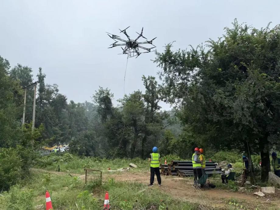 圖為市水務(wù)集團(tuán)首次引入無人機(jī)運(yùn)輸技術(shù),在東方山加壓供水系統(tǒng)改造工程中,將4公里管道運(yùn)送至海拔落差近400米的山間。