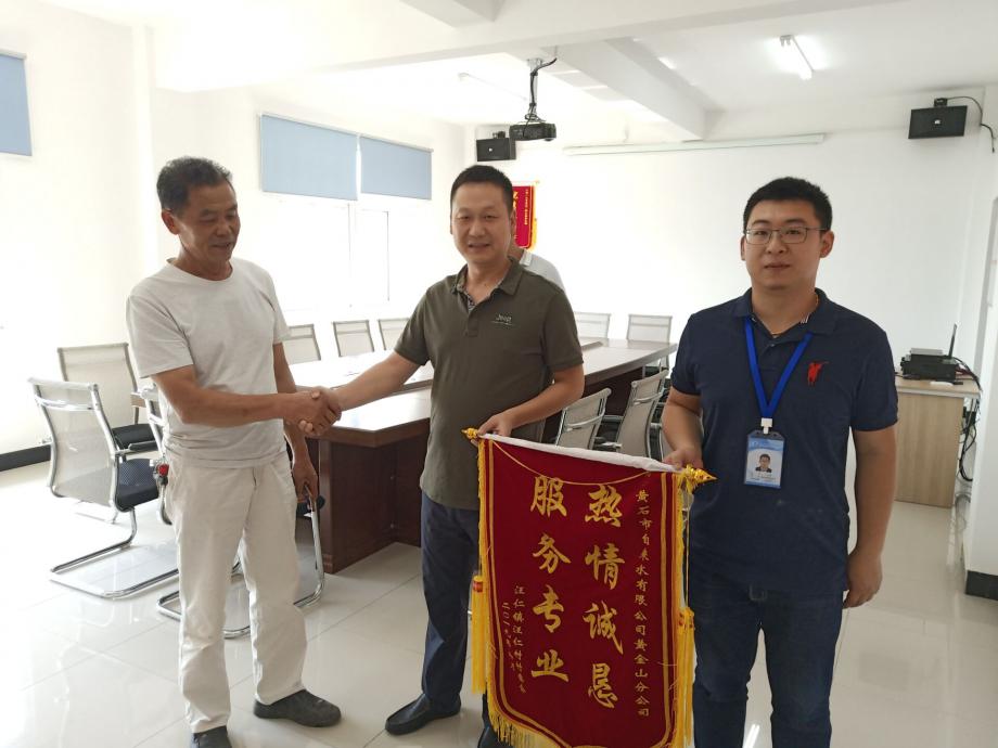 6月4日上午,汪仁鎮汪仁村相關(guān)負責人代表全村來(lái)到市自來(lái)水有限公司黃金山供水分公司,送來(lái)了一幅印有“服務(wù)專(zhuān)業(yè) 熱情誠懇”的錦旗,對他們貼心為民服務(wù)、真誠為民解憂(yōu)的行為表示感謝。