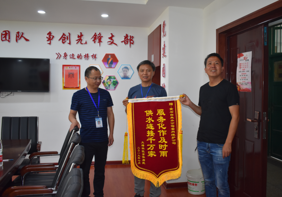 7月18日上午,下陸大塘社區及居民代表給黃石市自來(lái)水有限公司管網(wǎng)維護公司送來(lái)感謝錦旗——“服務(wù)化作及時(shí)雨,供水連接千萬(wàn)家”,感謝該公司連續三天奮戰工地,解決用戶(hù)用水難問(wèn)題。