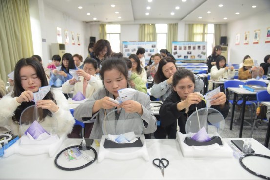 女職工們或是專(zhuān)心注入細沙,或是嘗試用多種顏色細沙混合放入,細沙因為力度、數量的不同,顯現出形態(tài)各異、造型別致的形狀。大家認真地投入自己的創(chuàng )作中,不時(shí)欣賞著(zhù)身邊人的畫(huà)作,精心設計間,“橫看成嶺側成峰,遠近高低各不同”,翻轉玻璃,彩色石沙在兩片玻璃間緩緩流動(dòng),慢慢沉淀成另外一副模樣,這正是流沙畫(huà)的魅力所在。
